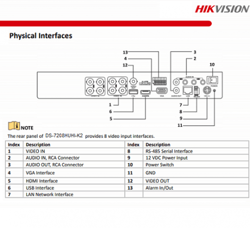 Bảng kết cấu mặt sau của của Đầu ghi Hikvision DS-7208HUHI-K2
